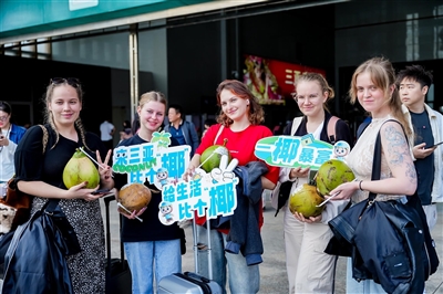 本报讯(记者 李少云)“太惊喜了!刚下飞机就收到礼物,还喝到了这么新鲜的椰子水。”昨日下午,走出三亚凤凰国际机场的武汉游客李女士一手抱着椰子文创玩偶,一手举着青椰,脸上洋溢着笑意。她告诉记者,这是她第一次在元旦来到三亚,感受暖冬迎接新年,没想到一落地就被这份热情“暖到了”。